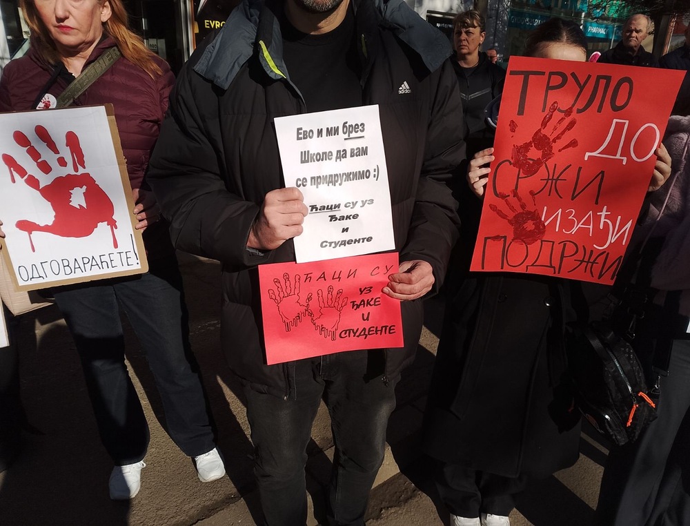 Okupljeni su nosili transparente sa natpisima “Ne bi bilo ove krvi da je bilo sve po zakonu”, BloKada ako ne sada”, “Za pravdu svi u blokadu”, “Bolje par dana van škole, nego ceo život van zemlje”, “Škole ćemo nadoknaditi, a 15 života nećemo”, “Nas je ipak više”.