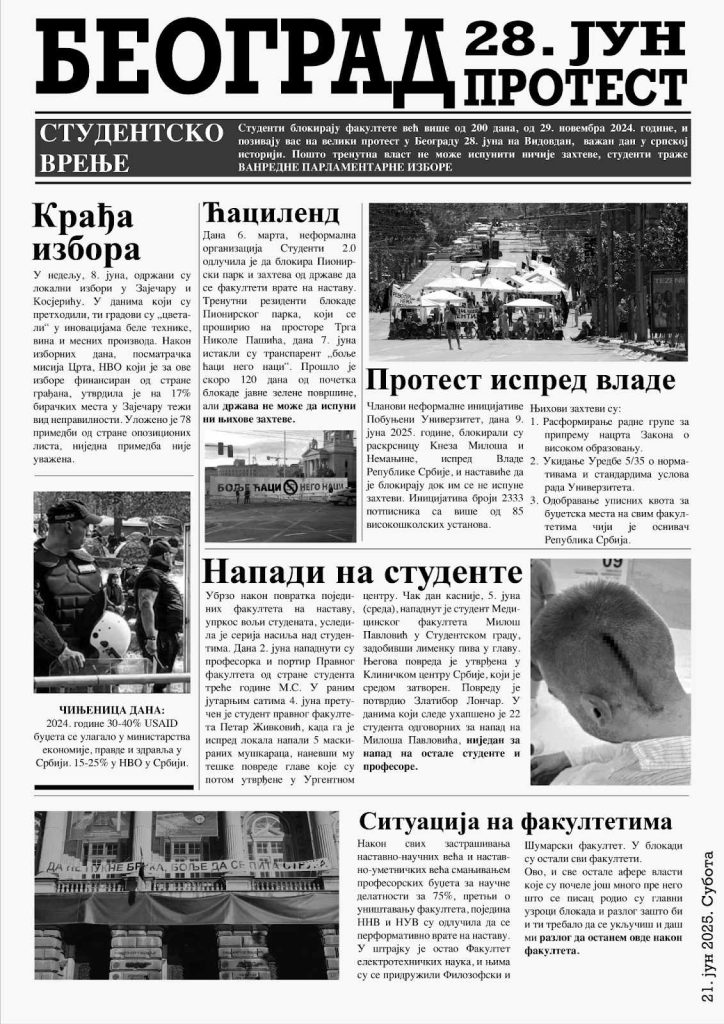 Studenti Univerziteta u Beogradu, koji blokiraju svoje fakultete od 29. novembra 2024. godine, pozvali su građane na veliki protest koji će biti održan u Beogradu u subotu, 28. juna, na Vidovdan, navodeći da je to “veliki dan u srpskoj istoriji, dan pobede koja nije priznata, jer onaj jači određuje pravila”.
