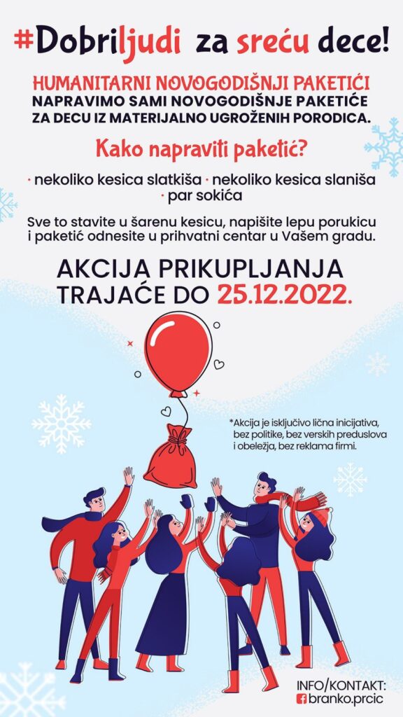 “Pozivamo sve društveno odgovorne kompanije i građane da nam se priključe u ovoj akciji. Mogu se donirati slatkiši, slaniši, igračke ili novac za tu namenu. Pored toga, mi smo petkom i subotom ispred Robne kuće ‘Panda'”, poručuje potpredsednik udruženja, Davor Vilotić.