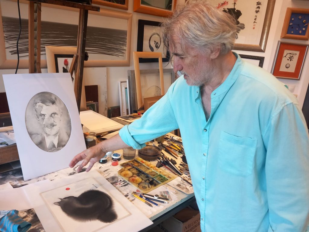 “Uvek krenem od filozofije prema kojoj treba da bude i spontanog i proračunatog. Mačke pravim na mokrom papiru. Povučem četku namočenu u tuš i onda se to razlije po papiru i od jednog poteza ja dobijem, ako ne pola mačke, onda rep sigurno, sa svim dlakama. Ne može se tačno izračunati gde će ta linija stati. Treba pogoditi trenutak, ali svakako je potrebna spontanost. Ja to onda ‘spašavam’ koliko mogu, u smislu da to ostane mačka sa njenim detaljima. Tu su čari akvarela koje druge tehnike nemaju”, objašnjava ovaj majstor akvarela, i nastavlja: