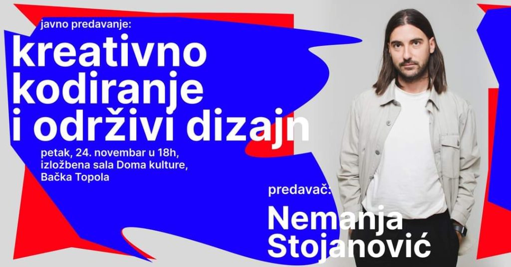 Nemanja Stojanović, grafički dizajner sa više od 15 godina iskustva rada u kulturi i kreativnim agencijama iz Beča i Londona, vodiće večeras bačkotopolsku publiku kroz fascinantni svet vizuelne komunikacije i principa održivog dizajna, te održati predavanje o dizajnu kao oblikovanju bitnih informacija.