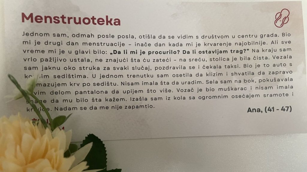 „Prvi komentar koji smo dobili je bio baš jako jeziv, a devojka koja ga je podelila sa nama je rekla da ju je otac nazvao ’stokom koja krvari’ zbog toga što joj je menstruacija procurela na čaršaf. Ona ima 18 godina i navodi da je to za nju bilo jako traumatično“, izdvaja Tijana jednu od ispovesti iz „Menstruoteke“.