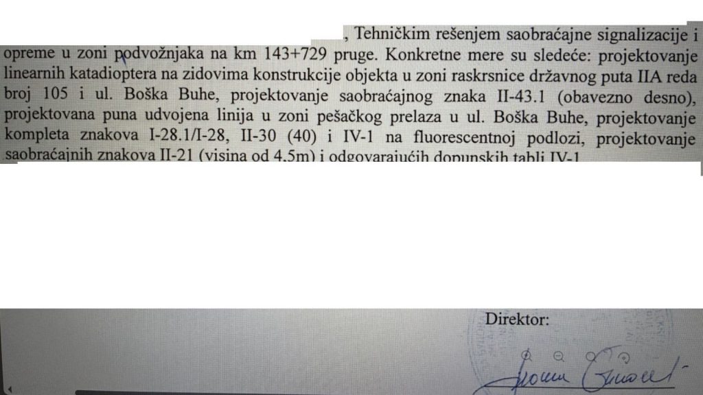 Za tumačenje konkretnih mera i tehničkog rešenja saobraćajne signalizacije i opreme u zoni podvožnjaka “na km 143+729 pruge”, koje nam je dostavilo JP za građevinsko zemljište, Magločistač se obratio dvojici saobraćajnih inženjera.
