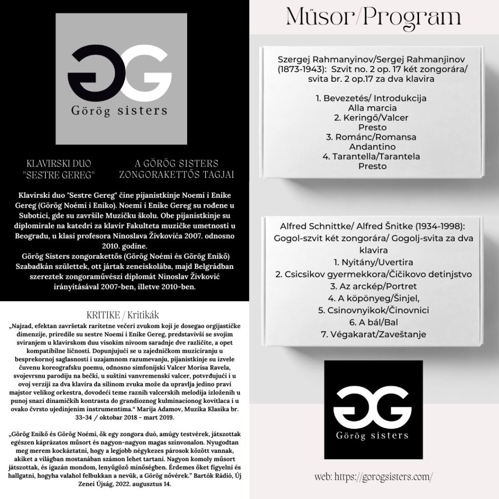 Poslednjeg dana manifestacije, 21. marta, nastupiće sestre Noemi i Enike Gereg iz Subotice, koje će izvesti koncert na dva klavira, kako je i nazvano koncertno veče koje će početi od 18.00 sati.