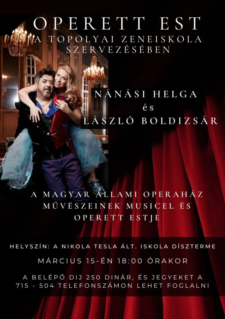Ovogodišnje “Dane muzike” otvoriće “Opersko veče” umetnika Mađarske opere iz Budimpešte, a nastupiće umetnica Helga Nanaši i operski pevač Laslo Boldižar. Koncert će biti održan 15. marta od 18.00 sati u svečanoj sali OŠ “Nikola Tesla”.