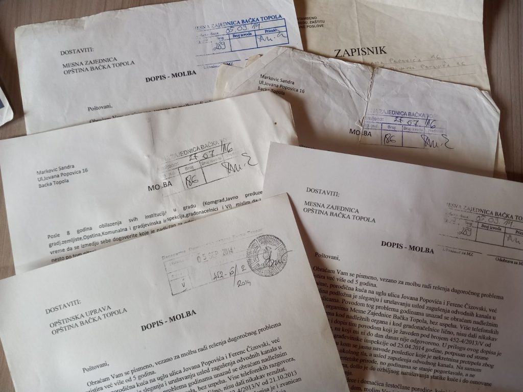 “Tamo me je tadašnji predsednik tri-četiri godine ‘vukao za nos’ obećavajući mi da će sanirati problem. U to vreme nisu poricali nadležnost, nego obećavali rešenje. Čak su mi rekli i da slikam po kući nastalu štetu, obećavajući mi i neku naknadu štete, sve sam to slikala i poslala”, priseća se Sandra, pokazujući brojne zahteve, molbe, dopise i fotografije.
