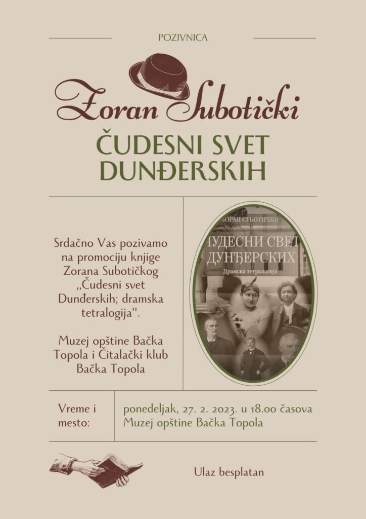 Dramska tetralogija pod naslovom ,,Čudesni svet Dunđerskih”, koju čine četiri dramska teksta o Lazaru i Bogdanu Dunđerskom, te Lenki Dunđerski i Lazi Kostiću, autora Zorana Subotičkog, biće predstavljena u ponedeljak, 27. februara, u Muzeju opštine Bačka Topola.