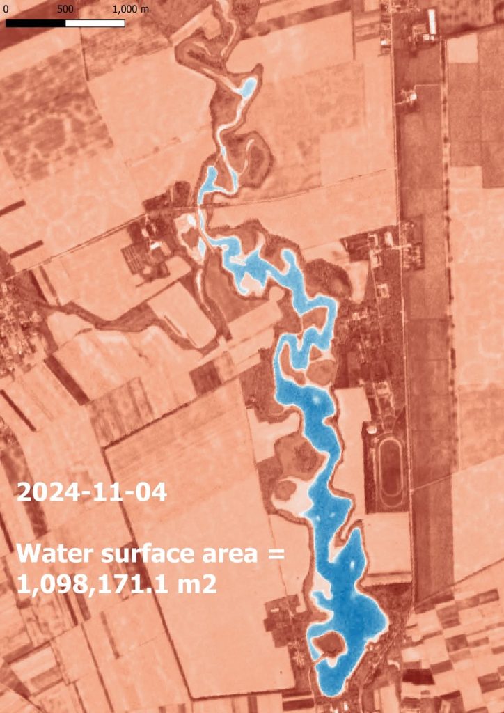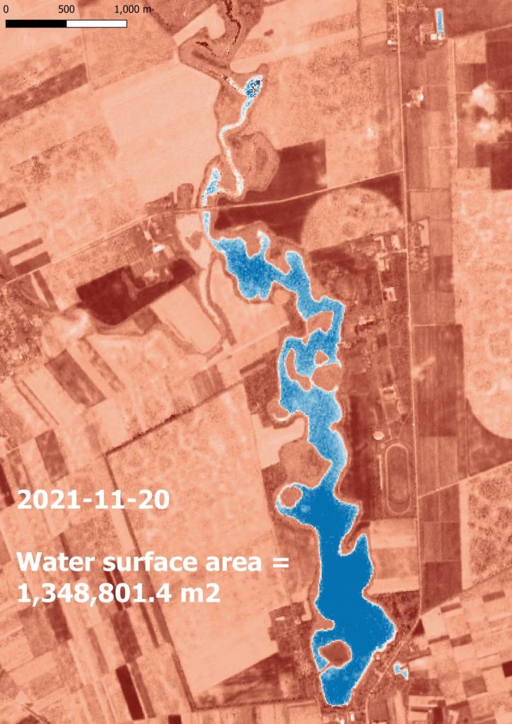 Lihi Atila: Poređenje satelitskog snimka 20.11.2021. kada je površina vode iznosila 1,348,801 metara kvadratnih, i 4.11.2024. kada te mere iznose 1,098,171 kvadratnih metara, što je razlika 250,630.