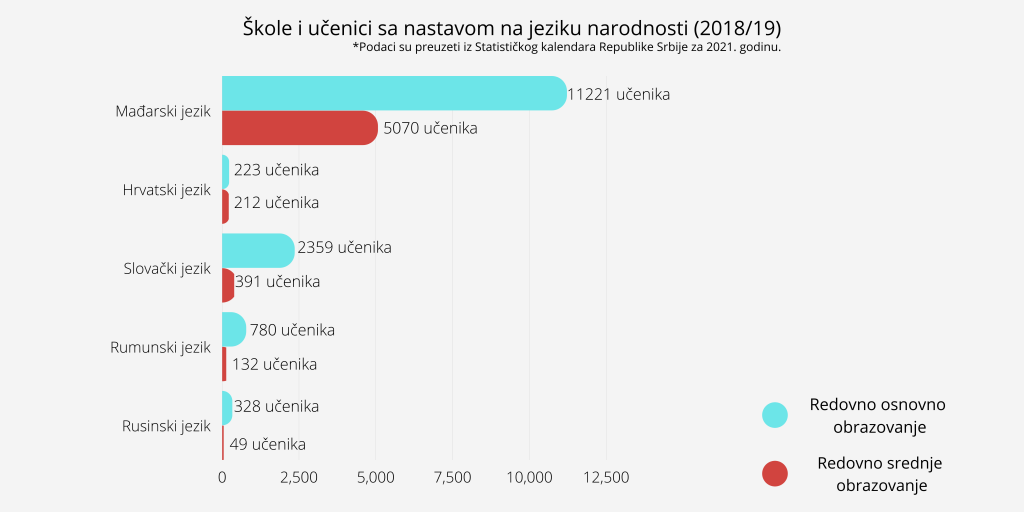 U Statističkom kalendaru Republike Srbije za 2021. godinu, navodi se da je u školskoj 2018/19, kao poslednjoj navedenoj izveštajnoj godini, nastavu na jezicima narodnosti pohađalo je ukupno 37.955 učenika u osnovnim i srednjim školama, među kojima su najbrojniji bili oni na mađarskom – 16.291, dok su drugi po brojnosti bili učenici koji su nastavu pohađali na slovačkom jezku.