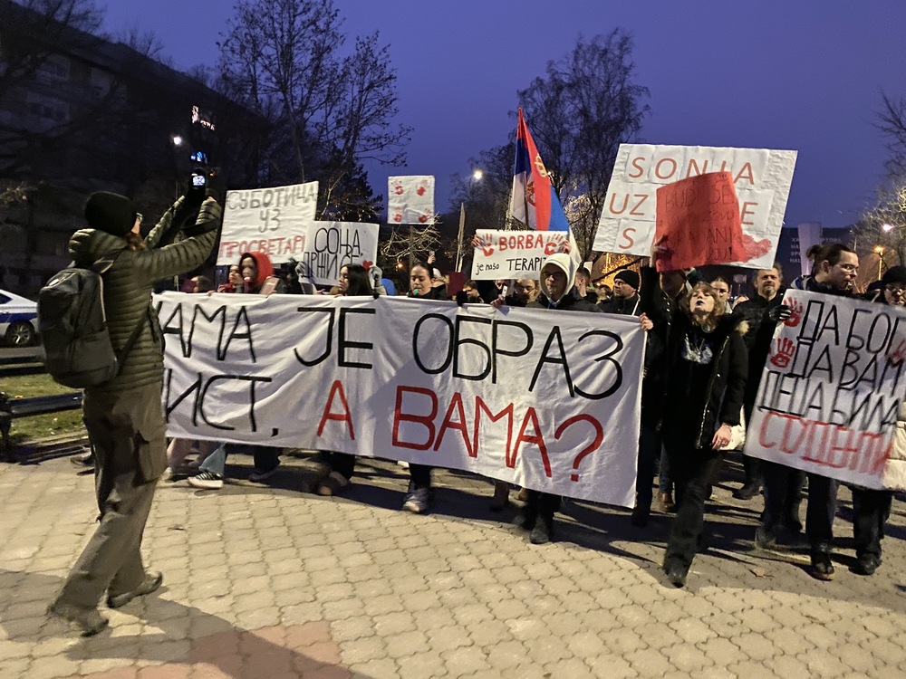 Studenti Ekonomskog fakulteta u Subotici su večeras zajedno sa građanima i pojedinim profesorima na do sada najbrojnijem okupljanju u poslednjih mesec i po dana, od kada traju protesti u ovom gradu, održali prvu šetnju od Hale sportova u Dudovoj šumi do Trga Slobode, u centru grada.