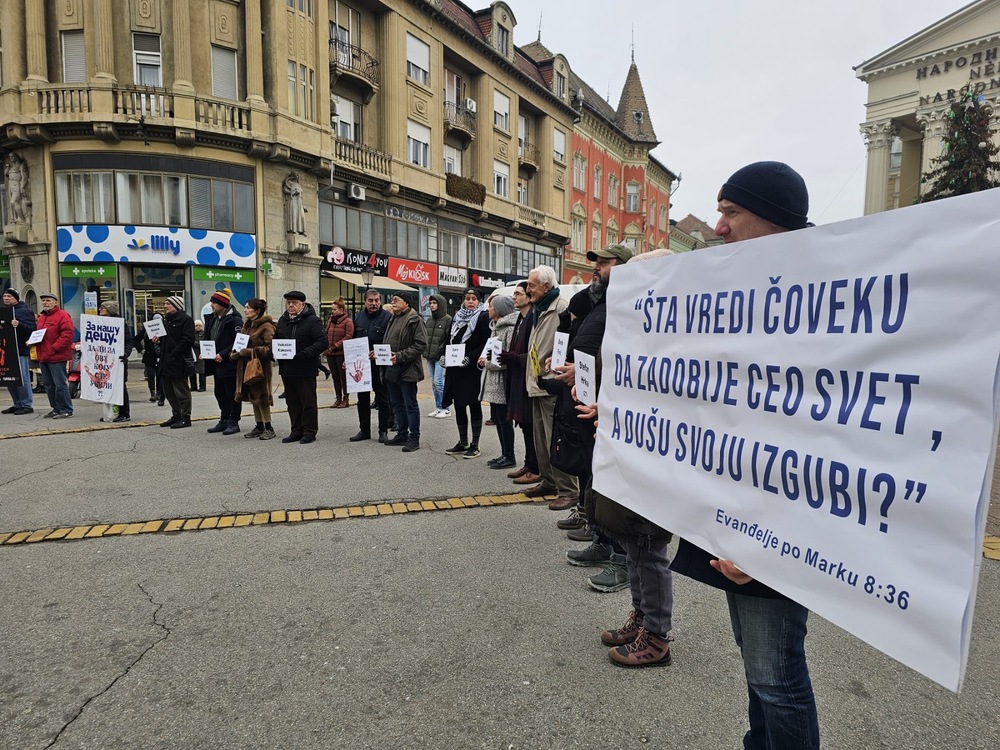 Oni su u rukama držali papire sa imenima 15 žrtava i transparente na kojima piše: „Šta vredi čoveku da zadobije ceo svet, a dušu svoju izgubi!?“, „Za našu decu. Da li za ovu koju ste ubili?!“.