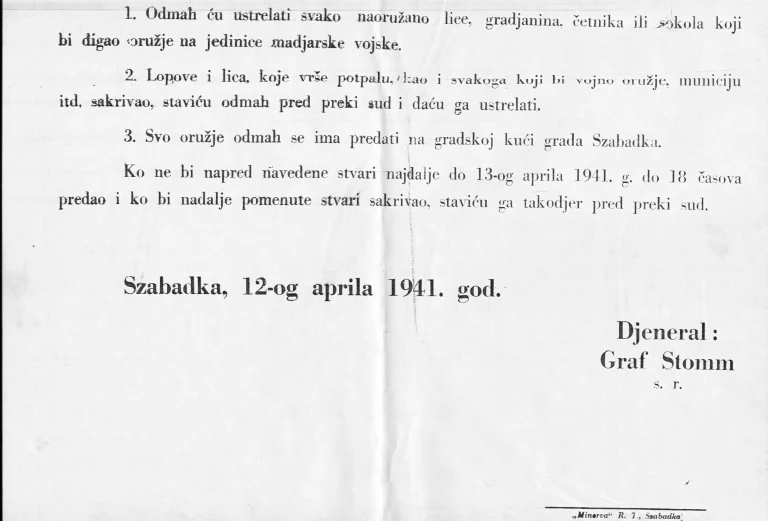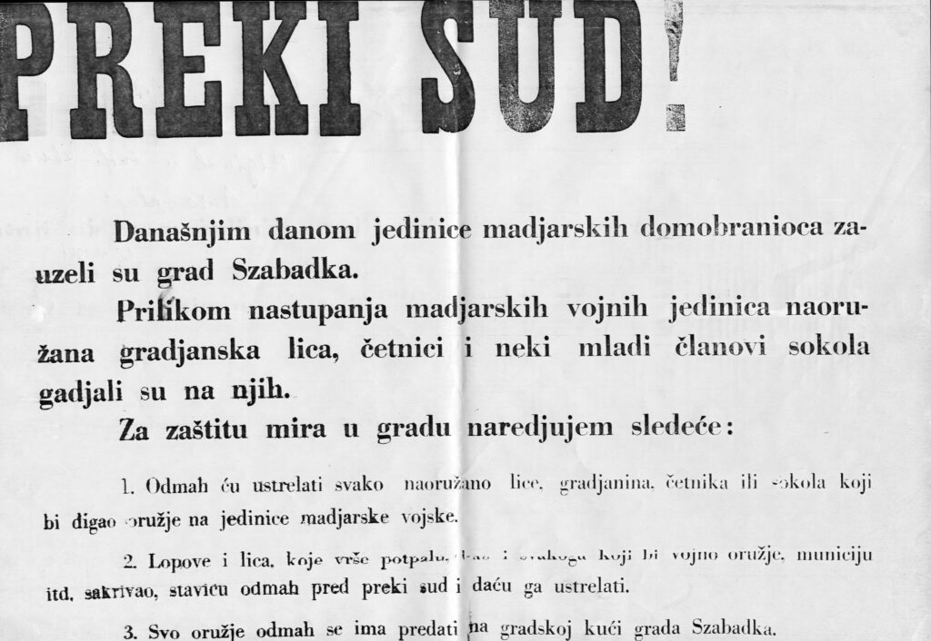 U proglasu o proglašenju Prekog suda u kom se lokalnom stanovništvu nalaže predaja oružja navodi se da će biti streljano svako „naoružano lice, građanin, četnik ili sokol“ koji digne oružje na jedinice mađarske vojske.
