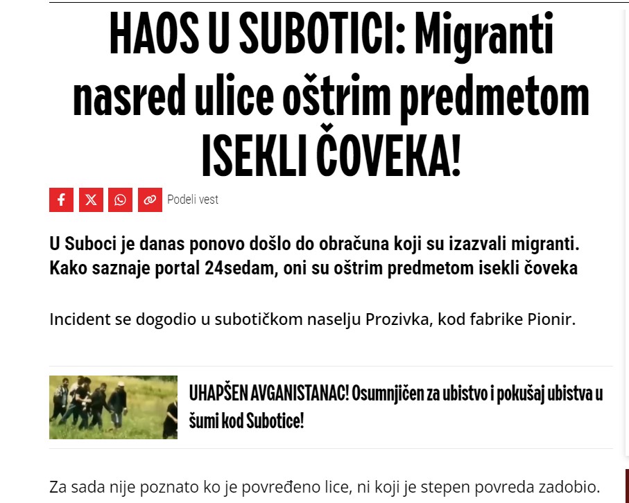 Tako je 6. jula 2022. godine u roku od svega nekoliko minuta (!) na gotovo svim tabloidnim portalima osvanuo jedan isti naslov: “Ponovo haos u Subotici: Migranti isekli čoveka nasred ulice!”.