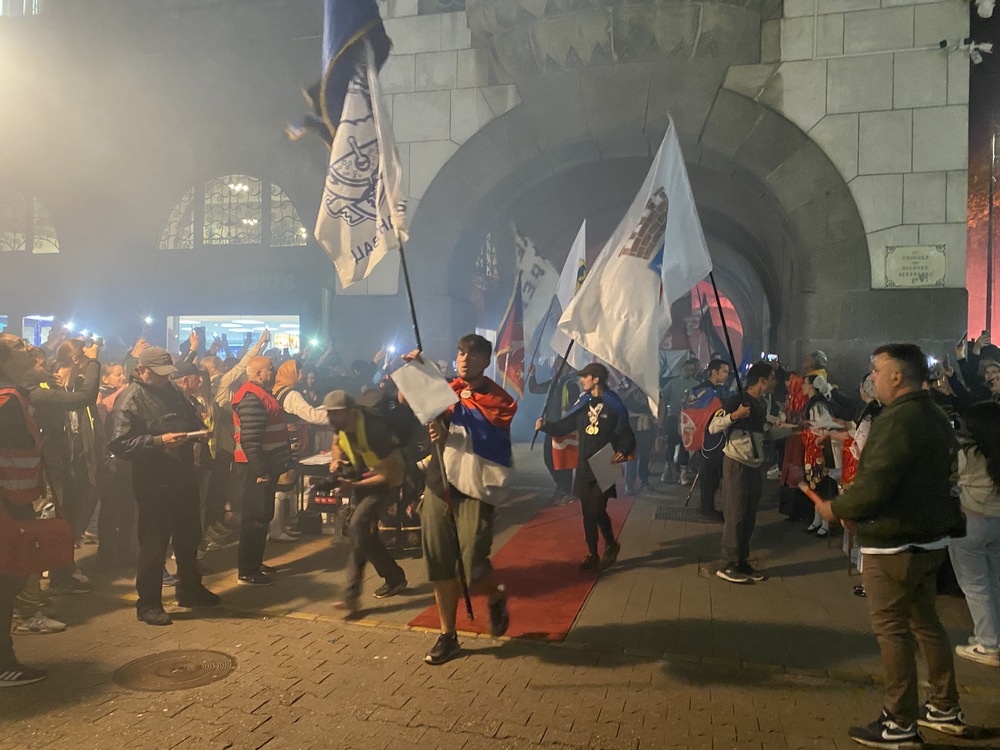 Studenti pešaci koji su proteklih dana pešačili iz više gradova Srbije i biciklisti dočekani su večeras na crvenom tepihu u centru grada u Subotici, uz baklje i muziku, kako bi učestvovali na protestu koji će u subotu, 17. maja, biti održan u ovom gradu. Studenti domaćini su ih pozdravili sa „Dobrodošli, poštovani oslobodioci Srbije“.