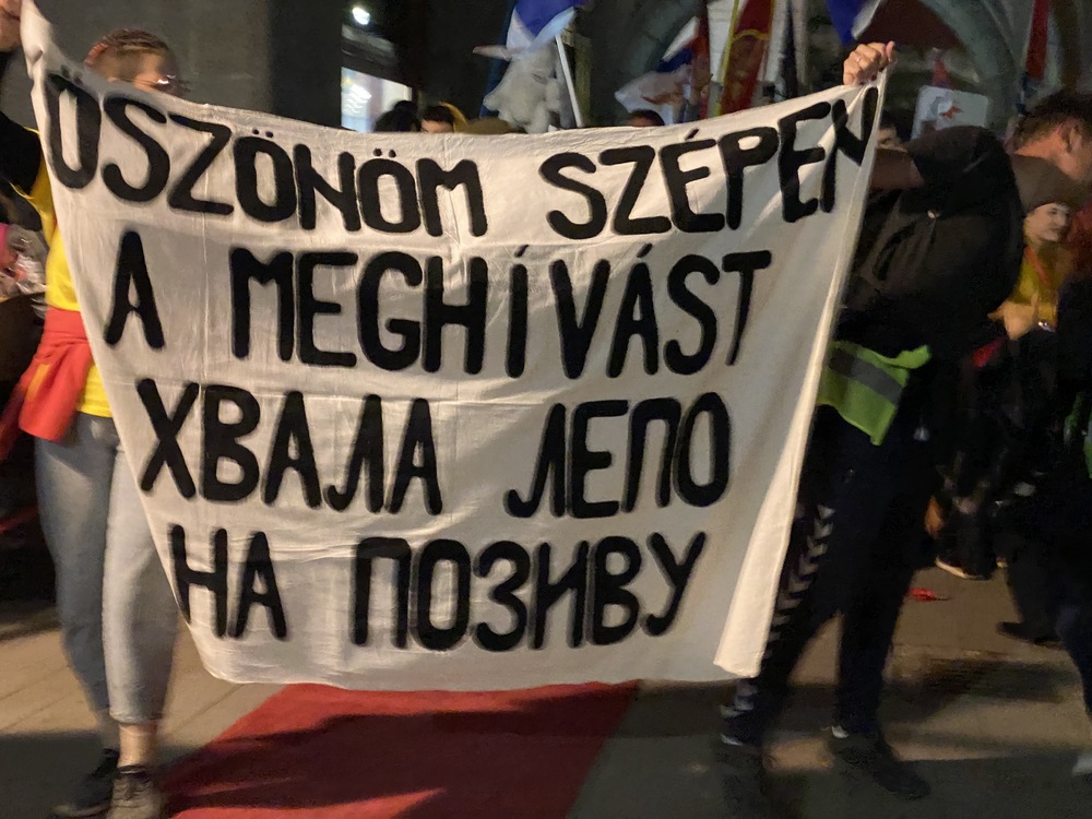 Devojke u narodnim nošnjama uručile su zahvalnice studentima koji su stigli u Suboticu, koji su nosili transparente na kom je pisalo na mađarskom i na srpskom jeziku „Köszönöm szépen a meghívást – Hvala lepo na pozivu“, “Jó napot – Dobar dan”, u duhu slogana protesta koji glase „Tessék – Izvolite“, „Sever zove“ i „Da poravnamo ravnicu“.