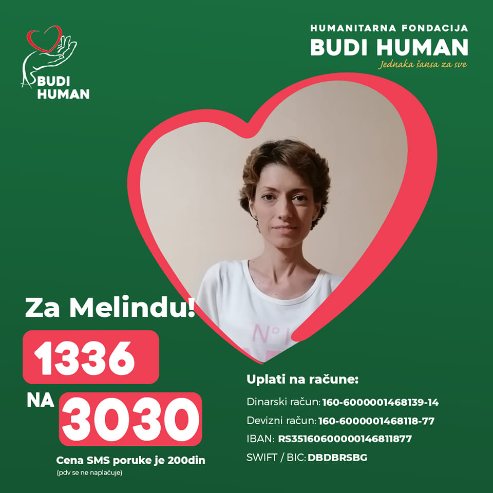 „Melinda je supruga, Melinda je majka dve preslatke devojčice od 8 i od 4 godine. Melinda je potrebna svojim devojčicama, svom suprugu, svojoj rodbini i prijateljima. Melindi je potrebno 150.000 evra za novi život koji je dele od toga da uživa u odrastanju svojih devojčica“, podsećaju.