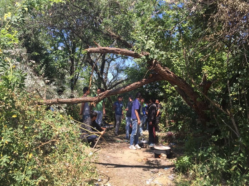 Prognanike smo susreli najpre na „izvoru“ pijaće vode – kod česme koju je grad nedavno instalirao na zgradi kod prečistača, umesto cisterni koje su u početku dopremane. Dvadesetak mladića se kupa i pere odeću na česmi, a mnogi pune vodu u plastične flaše i nose dalje u „džinglu“, kako se kolokvijalno naziva prostor oko ciglane na kojem nalaze predah. Na putu prema česmi susreli smo Muzarefa iz Avganistana, sa dvogodišnjim dečakom u naručju, kojeg je poveoa na „tuširanje“. U toku razgovora dete je uveliko zaspalo na očevom ramenu.