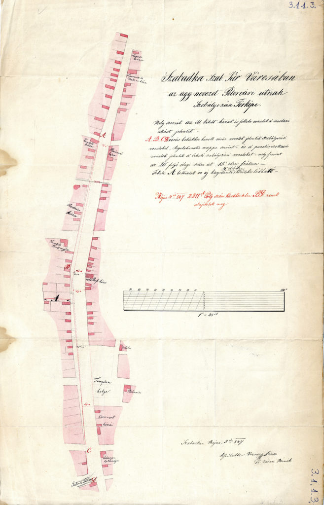 Za preduzimljive stanovnike grada najatraktivnije parcele za njihove kuće ili biznise bile su ili na centralnim trgovima ili locirane na glavnim putevima. U vreme Kovačeve karte grad je bio neregulisan, a posebno njegov centar, koji se tada u ne tako davnoj prošlosti još koristio kao vodena odbrana od napada neprijatelja, zatvaranjem brane i pretvaranjem današnjeg centra grada u jezero oko palisadama opasanog naselja u okruženju tvrđave koja se nalazila na mestu Franjevačke crkve. Trgovci, krčmari, zanatlije, kada je opasnosti od Turaka nestalo, raspoređivali su se duž glavnih puteva, i duž današnjeg Trga Jakaba i Komora, čijom sredinom je u vreme Kovačeve karte tekao vodotok iz Jasi bare prema Vrbovom potoku. Trg Jakaba i Komora bio je glavna ulica, koja je vekovima ostala pijaca i centralno mesto subotičke trgovine. To je bio i jedan od razloga zašto je Sinagoga upravo tamo izgrađena, u neposrednoj blizini tadašnje glavne gradske ulice.