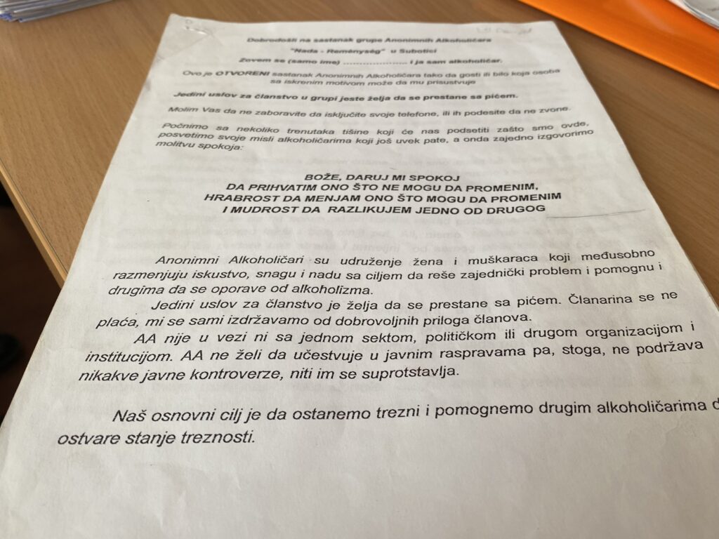 „Bože, daruj mi spokoj da prihvatim ono što ne mogu da promenim, hrabrost da menjam ono što mogu da promenim i mudrost da razlikujem jedno od drugog“, molitva je spokoja kojom započinju i završavaju okupljanja grupe anonimnih alkoholičara „Nada – Reménység“ u Subotici, koja se svakog četvrtka sastaje u prostorijama Fondacije mentalne higijene “Exspecto”.