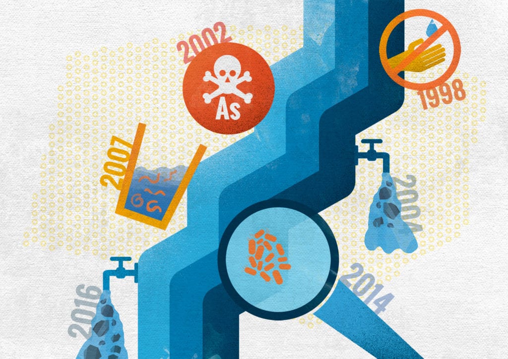 Arsen je prvi put ustanovljen analizom Instituta za javno zdravlje iz Novog Sada 14. otkobra 2002. godine kada je u vodi na izvorištima zabeleženo 30 puta veće prisustvo arsena od dozvoljenih 0,01 miligrama (10 mikrograma) po litri, kako je to bilo propisano Pravilnikom o higijenskoj ispravnosti vode za piće iz 1998. godine. Ta analiza ponovo je pokazala da je u sirovoj vodi prisutna i visoka koncentracija prirodnih organskih materija, te je na osnovu svega toga odžačka voda proglašena da ne ispunjava zahteve o higijenskoj ispravnosti.