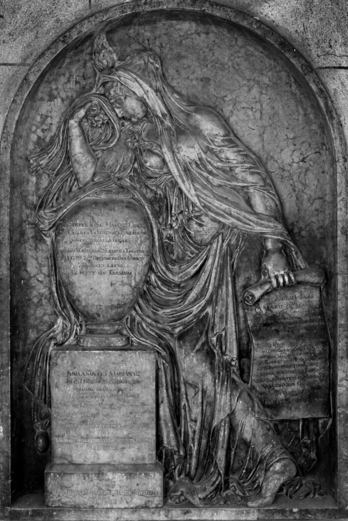Na postolju urne ispisan je tekst koji je posvećen „Márii Krixanovits” koja je preminula 29. januara 1811. Godine, a u samom dnu postolja uklesani su podaci o autoru i godini izrade reljefa.