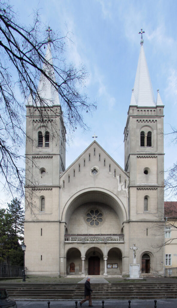 Na fasadi Franjevačke crkve postoji klasicistički reljef. Crkva se nalazi na Trgu cara Jovana Nenada 13. Na mestu ovog objekta nekada se nalazilo utvrđenje koje je 1470. podigao vlastelin Pongrac od Dengelega. Nakon progona Turaka iz tvrđave, ovde naseljeni franjevci osnivaju kapelu i manastir. Godine 1730. cela tvrđava je pretvorena u crkvu kojoj je dograđen i samostan. Temeljna obnova crkve započela je 1907. godine kada je objekat proširen i obnovljen u stilu neoromanike. Današnji izgled crkva dobija na osnovu projekta budimpeštanskog arhitekte Šandora Ajngera (Aigner Sándor, 1857–1912).