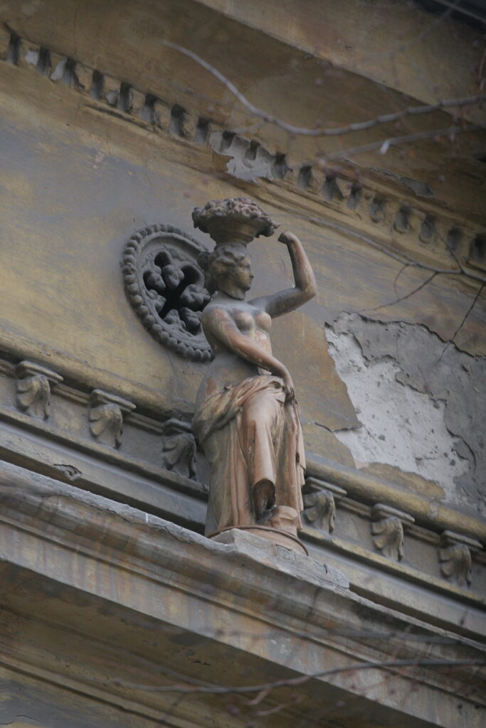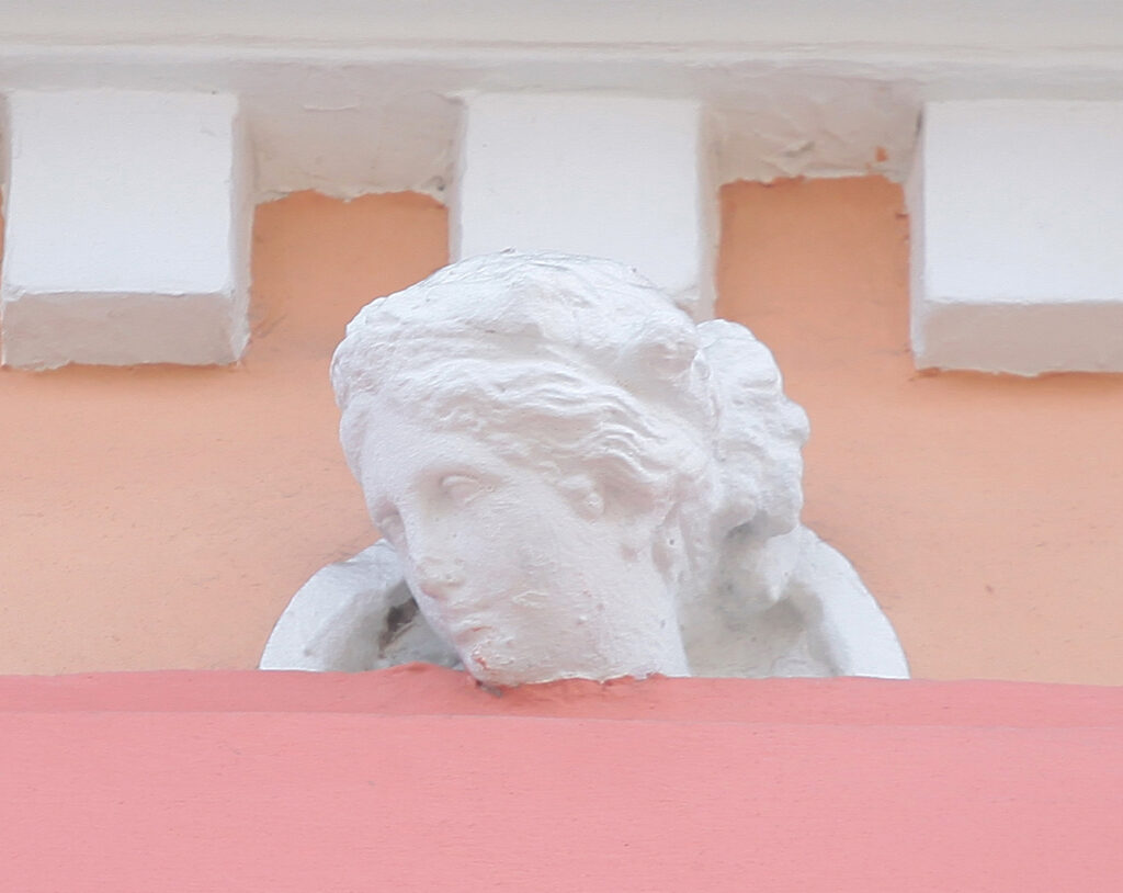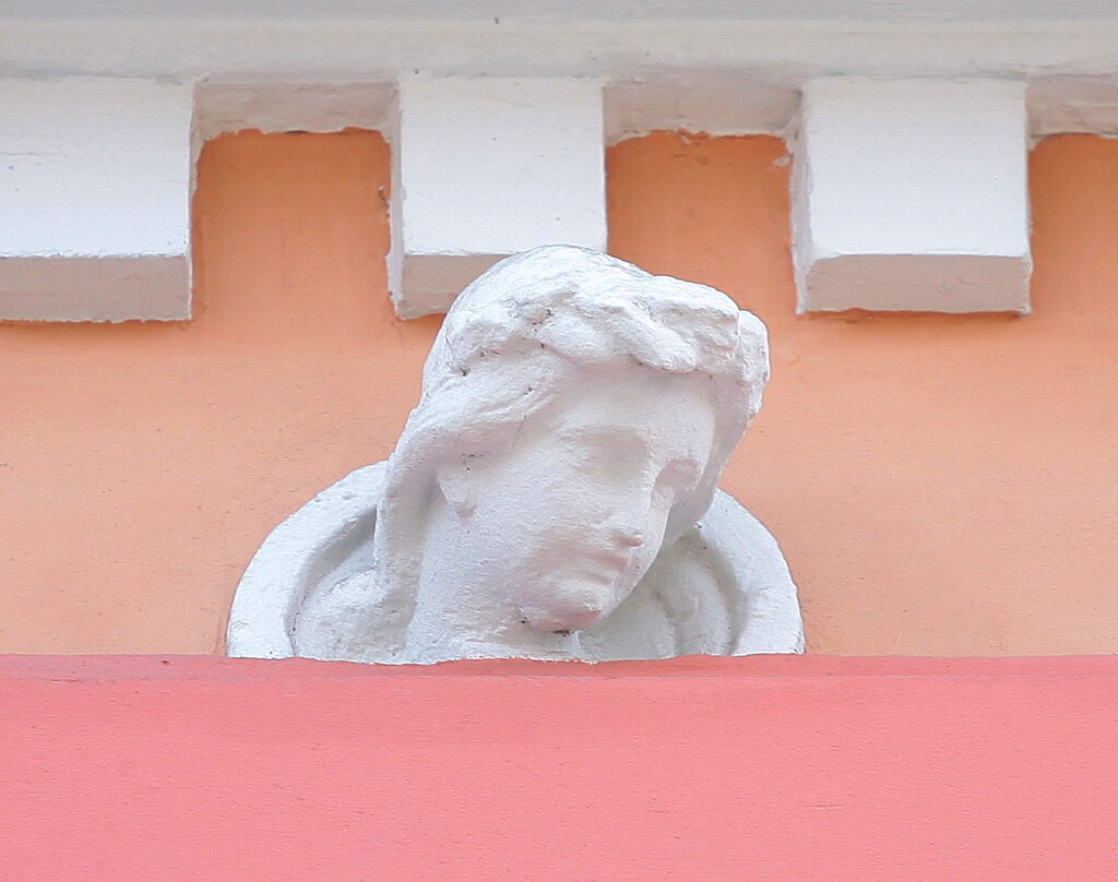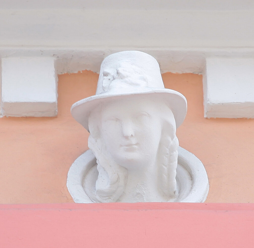 Na spratnom delu fasade, iznad balkonskog prozora locirana je minijaturna figura žene sa korpom izobilja na glavi. Sa njene obe strane nalaze se samostojeće figure dece. Ženska figura stoji u kontrapostu, do struka obavijena tkaninom koju graciozno pridržava desnom rukom. Lice figure je detaljno izvedeno sa naglašenom punđom antičkog izgleda. Skulptura je izuzetnog umetničkog kvaliteta, napravljena od terakote. Mali format, zatim činjenica da je slobodnostojeća figura, a naročito klasicistički tretman forme predstavljaju značajan primer umetničkog dela i zahtevaju posebnu pažnju.