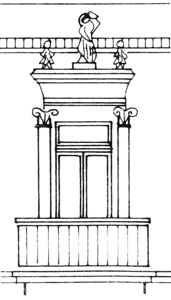 S obzirom da su u spratnom delu zgrade prikazane antičke boginje može se reći da muškarac sa bradom zapravo predstava Zevsa, kao vrhovnog boga grčke mitologije i njegove supruge Here. U poglavlju o elementim rađenim po kalupu spominje se ista muška figura takođe iznad ulaza, koju nalazimo u Resavskoj ulici broj 18 u Beogradu, kako leži na timpanonu koga pridržavaju karijatide. Zgrada na kojoj se nalazi ova figura datira iz 1890. godine i ovoga puta je u paru sa drugom muškom figurom.