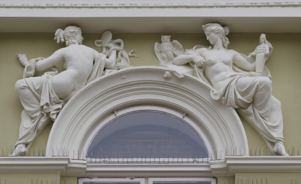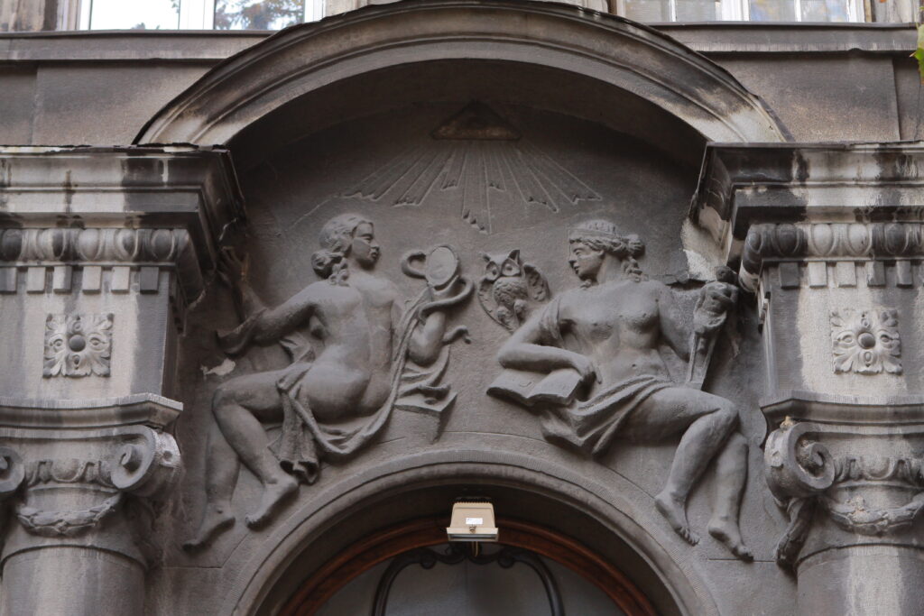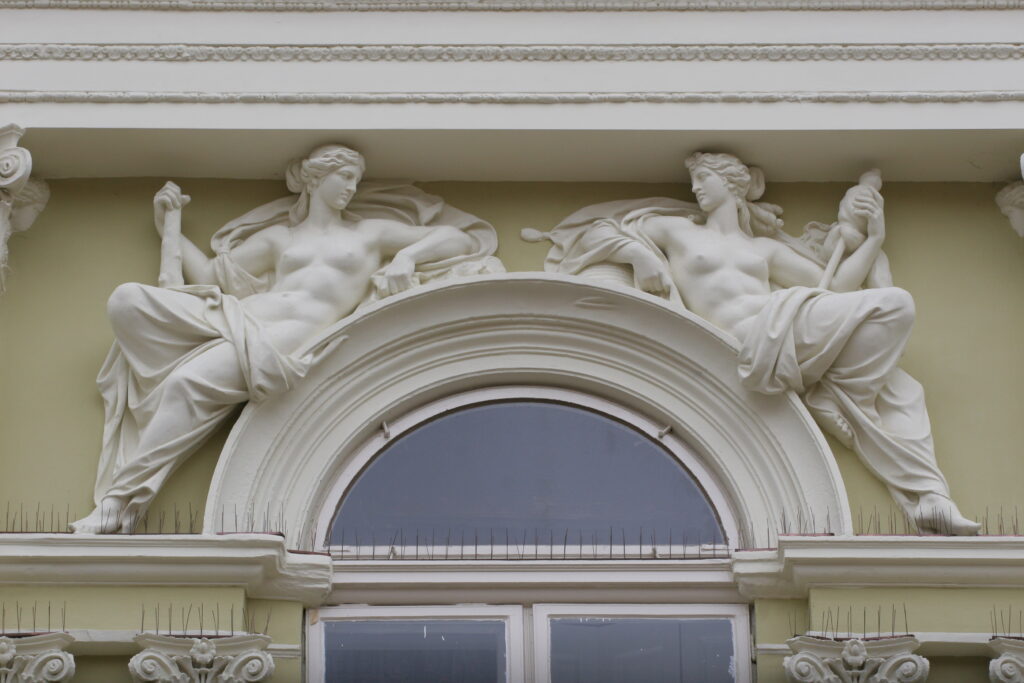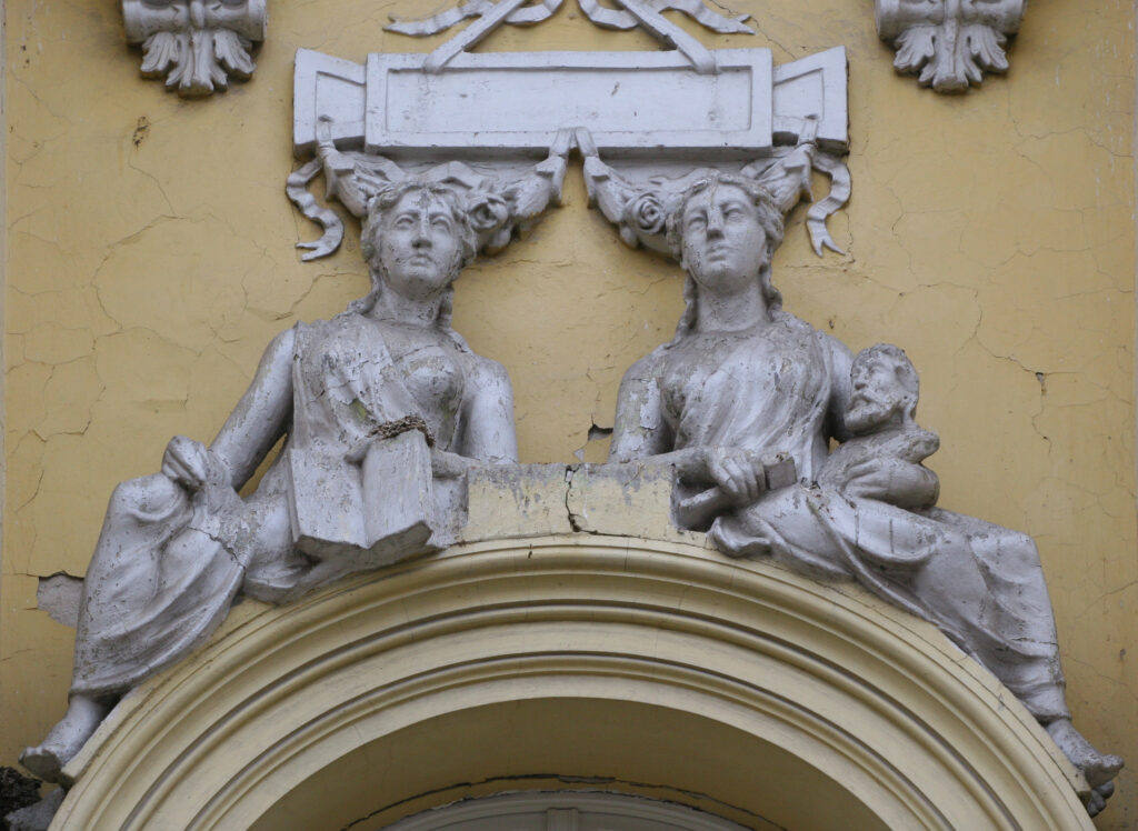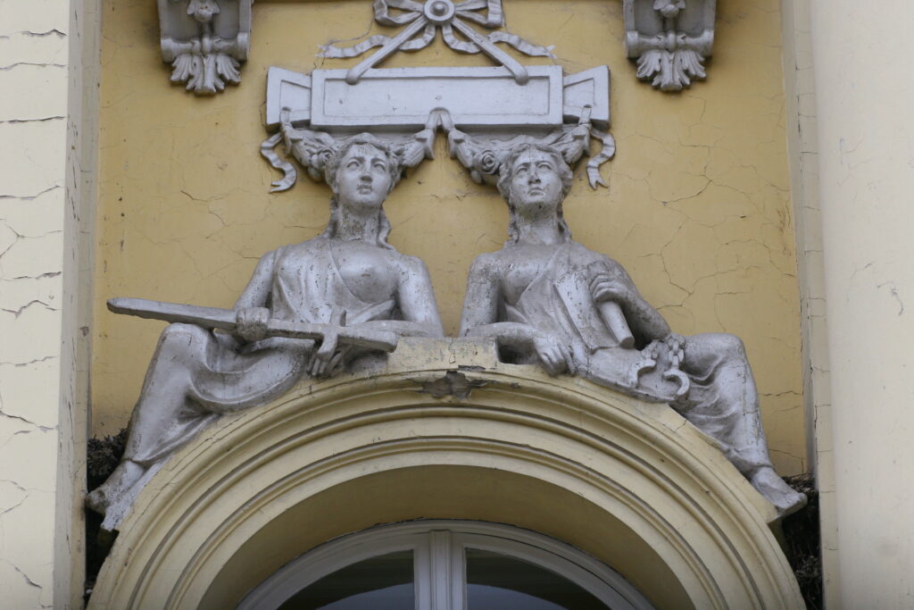 Iznad četvrtog prozora su dve ženske figure. Leva je prikazana sa otvorenom knjigom, a desna u rukama drži čekić i bistu, simbolišući muze poezije i vajarstva.