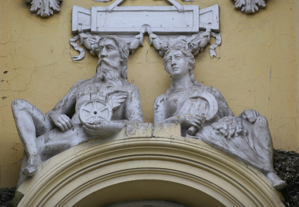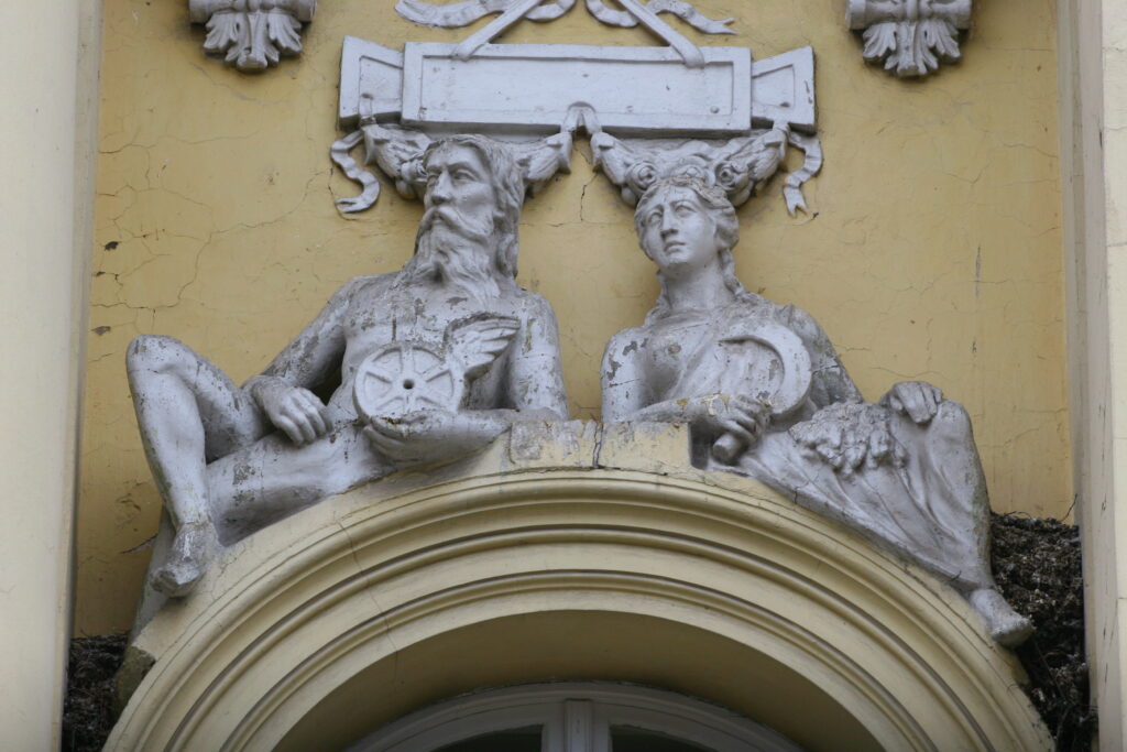 U prizemlju, u centalnom delu zgrade iznad ulazne kapije na kosinama timpanona, nalazimo figuru muškarca i žene. Figure su izvedene u punoj plastici kao slobodne skulpture, prikazane frontalno, u duhu renesansne skulpture, potpuno gole sa izvedenim mišićima i tetivama, sa detaljno izrađenim motivima kose i brade.