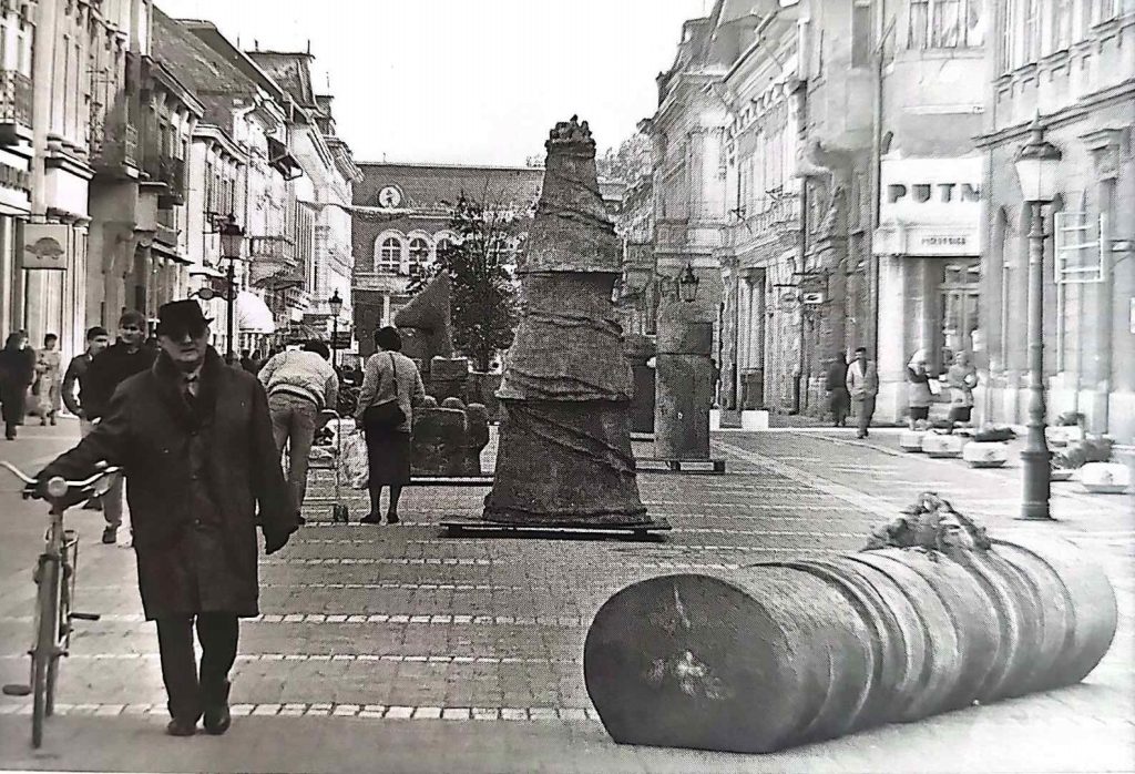 Manifestacija "Trideset godina vajarskih kolonija i simpozijuma Jugoslavije" bila je održana u Subotici 1991. godine, a zbog činjenice da je deo eksponata - po prvi put u istoriji grada - bio izložen u slobodnom prostoru, na Korzou i trgu pred Gradskom kućom, tada renomirani nedeljnik "Subotičke novine" nazvao je događaj - neponovljivim. (Izvor fotografije: arhiva Savremene galerije Subotica.)
