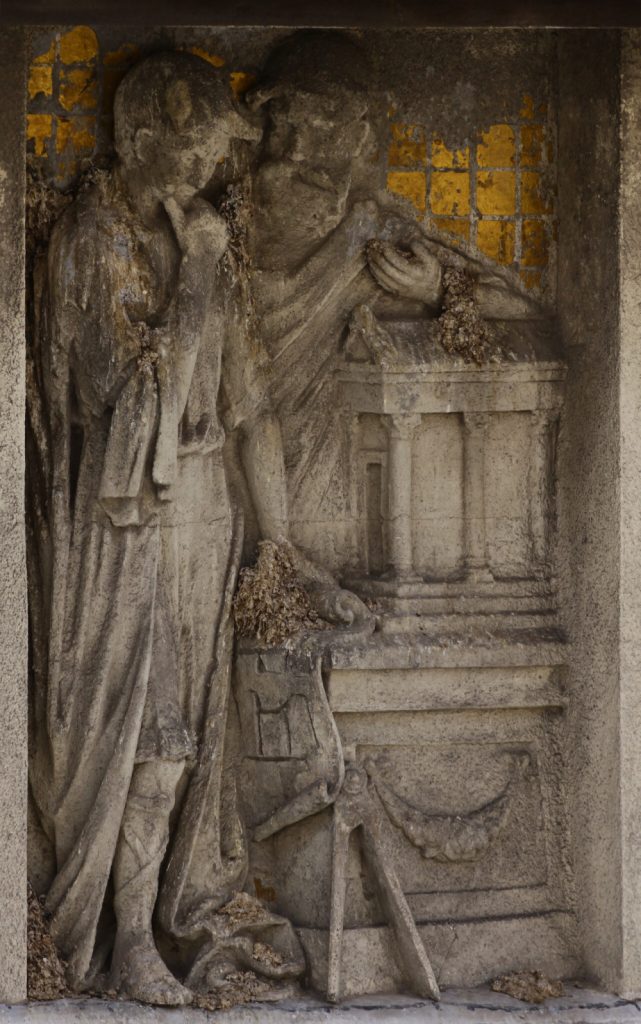 Na izvajanim reljefima, odmah ispod tornja u prvom polju nalaze se dve muške figure. Njihovi izrazi lica odaju zapitanost nad nekim naučnim ili tehničkim problemom, a u okviru kompozicije je predstavljen šestar, papirus i maketa antičkog hrama, što upućuje na pojam arhitekture.