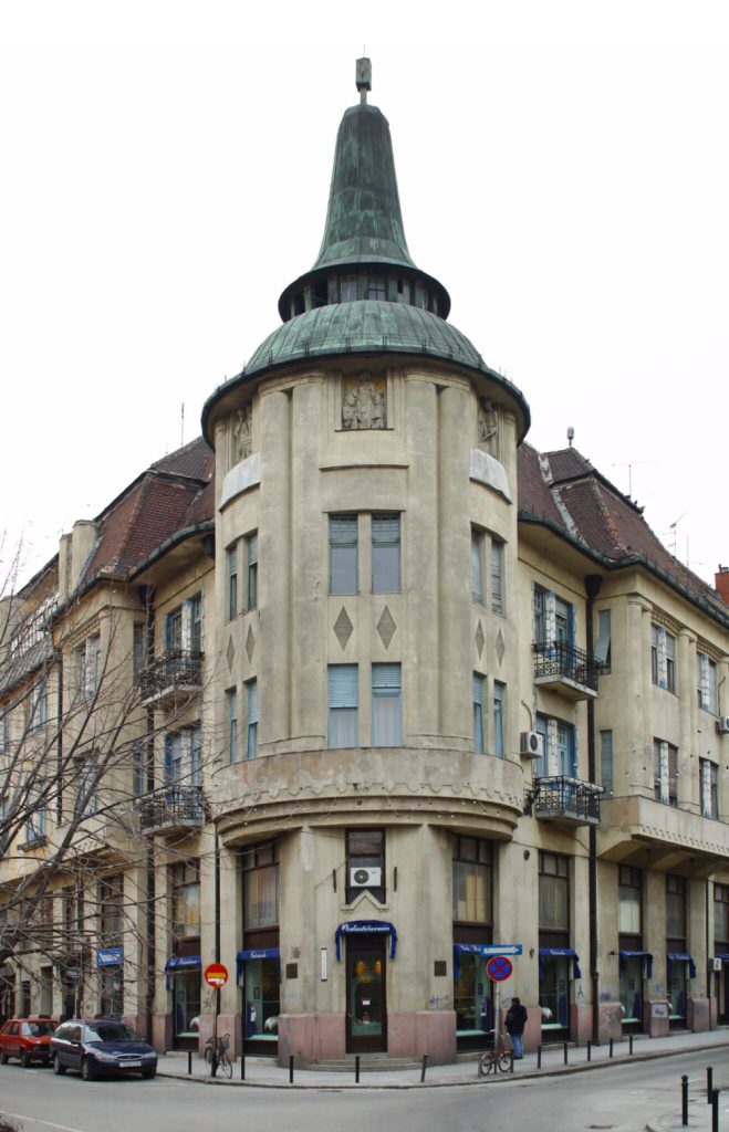 Ova fasada pozne varijante bečke secesije jedinstvena je u našem gradu. Zaobljeni ugao markiran je polukružnim erkerom, ispod čijeg se krova u visini nalaze reljefi sa tri figuralne kompozicije u kamenu sa pozlaćenom mozaičnom pozadinom. Forme ljudskih figura izvedene su u punom reljefu, naglašenog volumena. Na crtežima Pala Vadasa, sa konkursa za gradsku najamnu palatu iz 1911. vidimo da objekat nije izveden prema projektu, kao ni reljefi ispod tornja Gradske najamne palate. Ovi crteži rađeni su po uzoru na Klimta (Gustav Klimt 1862-1918), sa dekorativnom pozadinom u više boja. Prilikom realizacije, umesto kolorističkog rešenja datog na konkursu, pozadina je naglašena zlatnim kvadratnim poljima. Primećuju se i odstupanja u izvođenju položaja figura, kao i njihovih atributa.