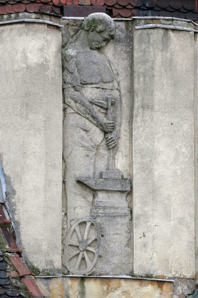 Nićin palata na Trgu slobode 2 izgrađena je po projektu Ferenca Bedea (Bedő Ferenc, 1890–1945) iz 1930. godine. Zgrada je podignuta u stilu akademizma sa elementima art dekoa, a skulpture su napravljene u visokom reljefu. Postavljene su na spratnom delu ovalno rešenog ugla i okrenute prema trgu. Svojim zadnjim delom uranjaju u fasadu zgrade. Predstavljaju skulpture muškarca i žene u prirodnoj veličini sa atributima koje drže u desnoj ruci. Muškarac drži čekić stojeći pored nakovnja, a žena drži srp dodirujući levom rukom klasje žita. Oni simbolizuju zanat i poljoprivredu, kao i osobenosti u kojima se muškarac kroz zanat kovača predstavlja kao čista snaga, a žena pored žita simboliše plodnost i život. Razlog postavljanja baš ovih simbola odnosio se na donji sprat palate koji je bio namenjen za poslovne prostorije. Figure su izvedene od veštačkog kamena i delo su vajara Mihalja Kara (Kara Mihály 1887?–1970). Figure su monumentalnih dimenzija i blago kubističke forme, što je karakteristično za ovog autora. Njegova skulptorska dela nalaze se i na drugim fasadama u Novom Sadu i Subotici i prepoznatljivog su likovnog izraza. Vajarstvo je učio u Budimpešti i Firenci. Radio je u Mađarskoj, gde je dobijao nekoliko poslova na konkursima za vajarstvo, a od 1919. živeo je u Nađvaradu (Oradea, Rumunija). Za javne portrete kralja Ferdinanda i kraljice Marije, 1925. godine dobio je priznanje Bene Merent od rumunskog kralja.