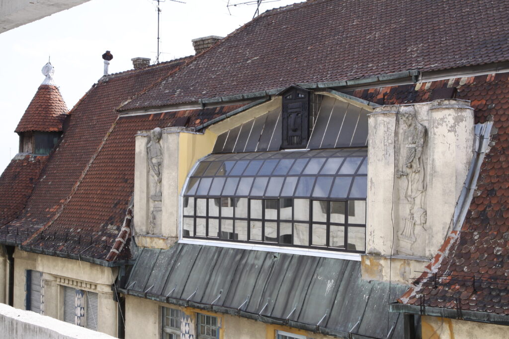 Gradski senat izdavao je elitne stanove ove palate, u prizemlju objekta bile su prodavnice, a u zgradi je dugo godina radila štamparija. Na mansardnom delu objekta okrenutog ka pozorištu, nalazi se stakleni zid prvog gradskog ateljea. Sa njegove dve strane nalazimo muške figure u plitkom reljefu, izlivene od veštačkog kamena. Jedna figura drži čekić naslonjen na nakovanj, na koji je prislonjen točak. Kombinacija ovih atributa ukazuje na alegoriju zanatstva i industrije. Druga figura je okružena predmetima koji simbolišu umetnost: lira muziku i pesništvo, vaza – primenjenu umetnost, slikarska paleta i četkice – slikarstvo, bista – vajarstvo. Dve figure su okrenute jedna prema drugoj pognutih glava prema ateljeu. Prikaz ukazuje na jedan od osnovnog koncepta secesije: bratstvo umetnosti i zanata tj. industrije, koje je poteklo od Raskinovog pokreta „Art and Crafts“. Prvobitne skice ukazuju na izuzetan dar za formu koji svoj uzor ima među primerima bečke secesije, kao što su npr. dela Klimta. Ceo objekat zapravo je pod direktnim uticajem bečke secesije. Projektne crteže reljefa u mansardi krova karakteriše smirenost geometrijske forme. Međutim, nepoznati majstor koji je oblikovao reljefe, nije vešto realizovao crtež projektanta koji je u sebi posedovao suštinu stila bečke secesije, tj. njegov geometrizam.