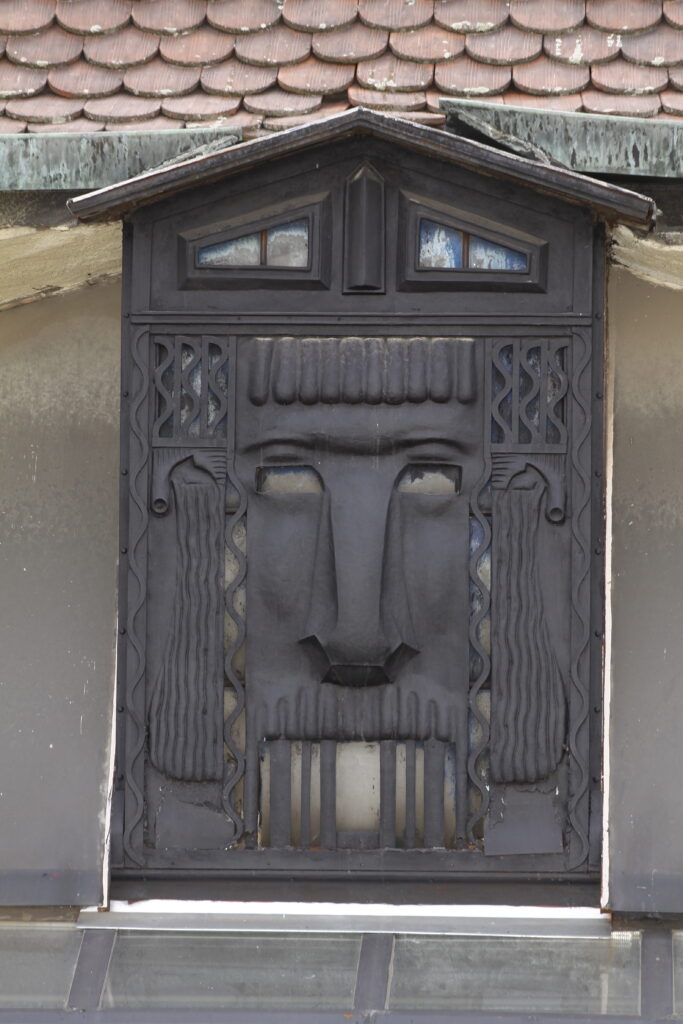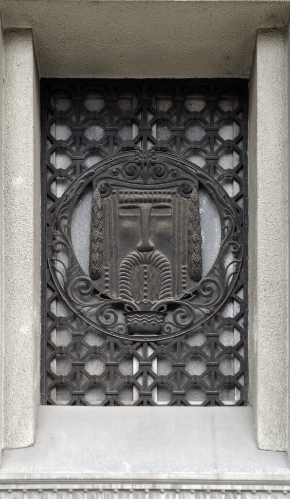 U centralnom gornjem delu staklenog zida nalazi se maska od kovanog gvožđa sa stilizovanom bradom i brkovima, a sličan motiv se nalazi iznad ulaznih vrata na uglu objekta. Ove maske su takođe rađene po uzoru na Klimtove grafike, koje na isti način predstavljaju antičke ličnosti, a imaju referencu i na subotičko pozorište.
