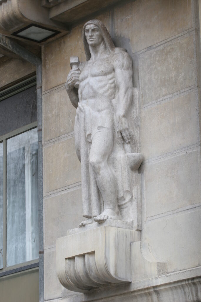 Skulpture su odlivene od veštačkog kamena i nešto su veće od prosečne ljudske figure, koje leđima uranjaju u fasadu. Prilikom pravljenja smeše od veštačkog kamena izuzetno je važan proces mešanja cementa sa kamenim zrnom i određenim polimerom. Potrebno je postići vibracije da bi se oslobodio vazduh koji se zadržava u smeši veštačkog kamena. Ukoliko se vazduh zadrži u porama, pod uticajem raznih hemijskih i fizičkih faktora dolazi do pucanja, a na površini forme do otvaranja pora. Svaki najsitniji otvor na površini materijala omogućava zadržavanje vlage, koja usled stvaranja leda bubri i razara strukturu materijala. Neke od tih promena nalazimo na površini ovih skulptura. Međutim, lako je premostiti ovakve pukotine, sve dok ne dolaze iz unutrašnje strukture materijala od koga su napravljene.