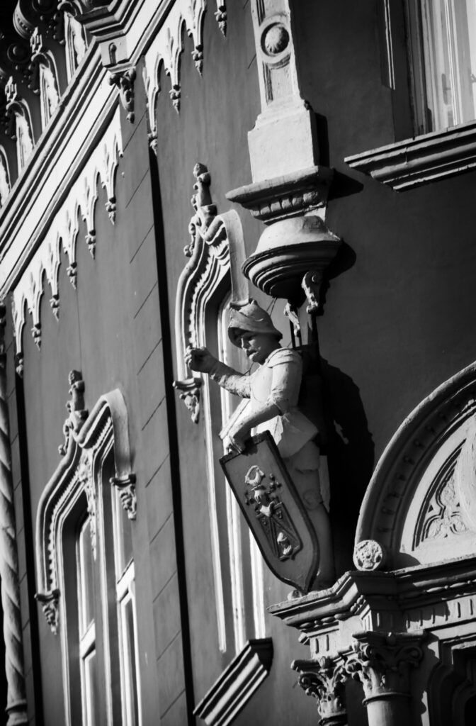 Šest godina kasnije palatu Mate Vojnića projektovao je arhitekta Janoš Jedlička (Jedlicska János), takođe oponašajući jedan stari stil, ovoga puta francusku verziju visoke renesanse. On je na prvom spratu erkera postavio slobodnostojeću figuru muškarca koji u jednoj ruci drži štit sa grbom, a u drugoj ruci je nekada držao koplje. Skulptura je izrađena od terakote i obojena. Zgrade Gradske biblioteke i Gimnazije mogle bi se pridodati nizu ranije pomenutih eklektičnih građevina, koje je na samom kraju veka u stilu neobaroka projektovao arhitekta Ferenc Rajhl (Raichle J. Ferenc 1869–1960). Na obe građevine skulpura značajno utiče na utisak monumentalnosti i raskoši. Takvu ulogu na Gimnaziji ima gipsana figura nagog mladića koji je rukama oslonjen na barokne volute, kao i figure anđela postavljene na vrhu pročeone kupole koje na svojim leđima nose globus, dok na zgradi Gradske biblioteke ovu ulogu imaju dva Atlanta izrađena u visokom reljefu koji nose centralni balkon građevine kao i puti smešteni u raskošnu lunetu dekorativne plastike iznad balkona. Na oba zdanja skulptura treba da doprinese osnovnim kvalitetima građevine i stila u kome je ona izgrađena.