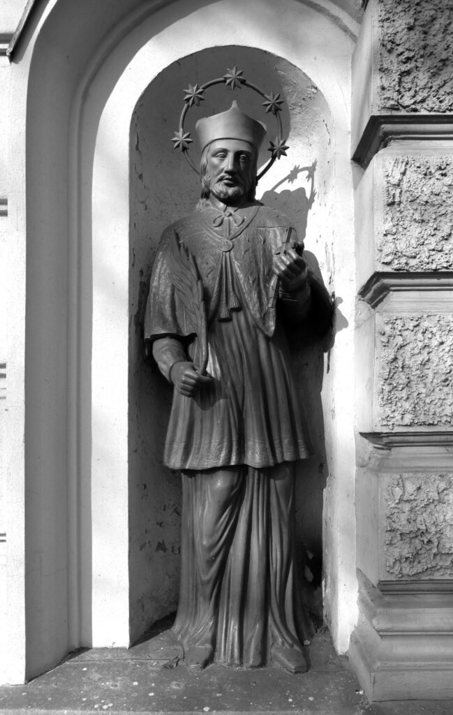 Skulptura Svetog Ivana Nepomuka se postavljala pored vodenih tokova, kako bi štitila grad od poplava. Na mestu gde sada stoji skulptura Svetog Ivana Nepomuka, postojao je most ispod koga je prolazio potok. Najpre je tok vode izmešten, a zatim potpuno ukinut. Međutim, skulptura je ostala na mestu gde je prvobitno bila postavljena. Zaštitnik od poplava i ispovedničke tajne predstavljen je sa oreolom sa pet zvezdi od metala i predstavom palmine grane u desnoj ruci. Palmina grana u hrišćanskoj simbolici podseća na pobedu mučenika nad mukama i smrću, pa ga zato Sveti Ivan Nepomuk drži kao atribut. U funkciji atributa su i njegova ispovednička roketa i biret na glavi.