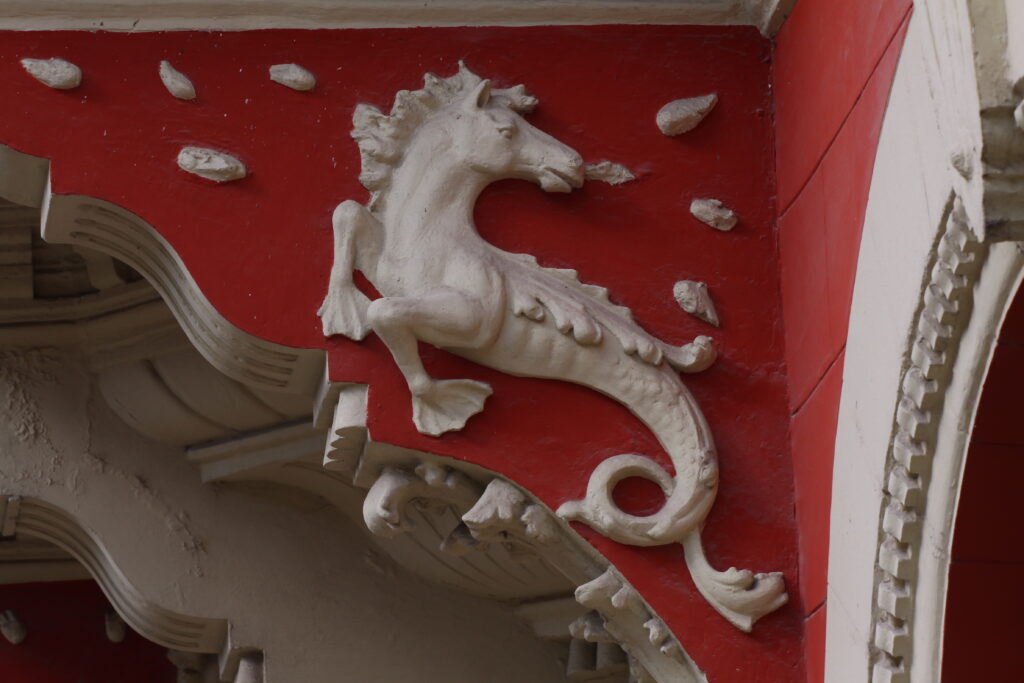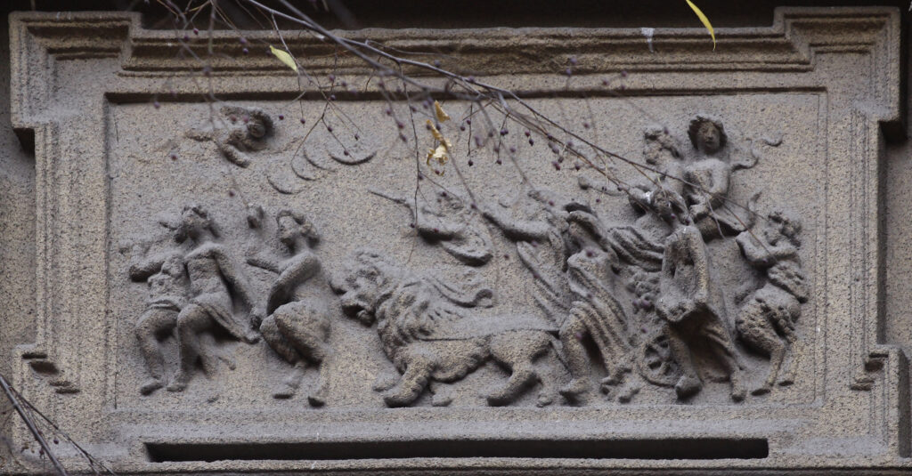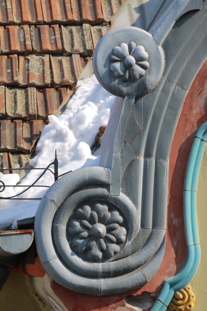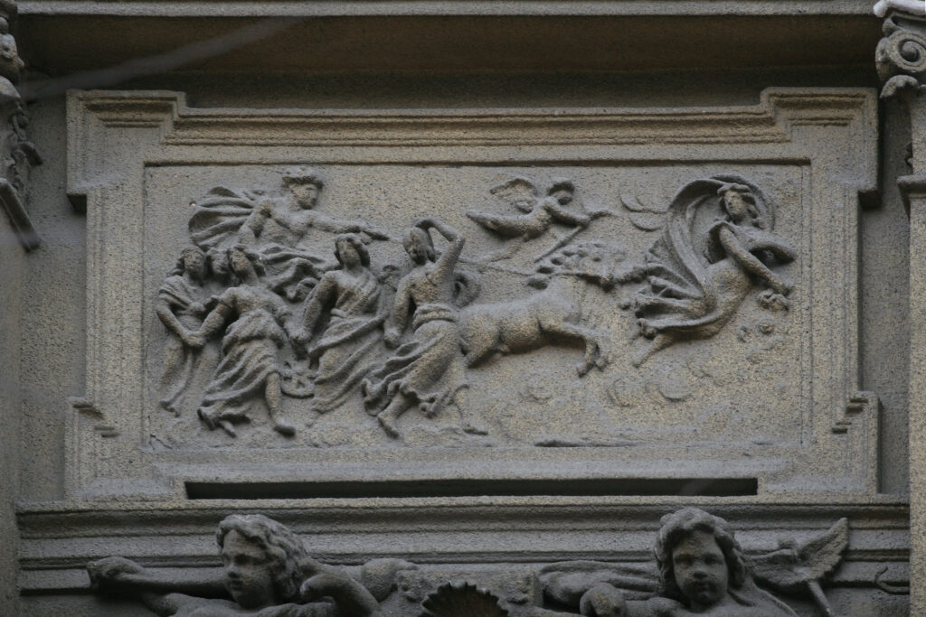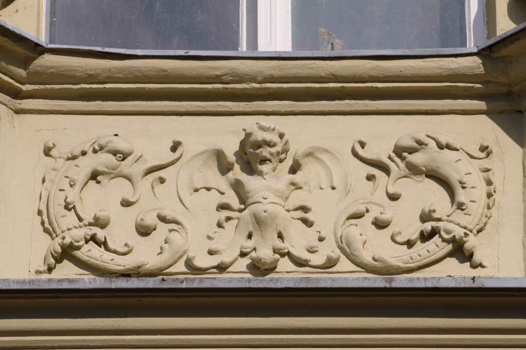 Upravo ove scenske predstave jedinstvene su na našim fasadama po svojim malim dimenzijama, u koje je smešteno mnoštvo figura sa detaljima koji ilustruju različite antičke mitove izvedene i veoma plastično. Sa obe strane svakog zasvedenog prozora naležu figure puta iznad kojih se javljaju reljefi puni dinamike i pokreta, vrlo karakteristični za barokni tretman forme. U rizalitima je naglašen timpanon sa otvorenom školjkom iznad koje je na fasadi izveden dekorativan reljef sa krilatim sirenama poniklim iz floralnog miljea. Lavlja glava pojavljuje se na rubovima krova kao i iznad ulazne kapije. Ikonografija anđela, školjki i scena u reljefnim poljima je tipična za eklektičnu mešavinu stilova.