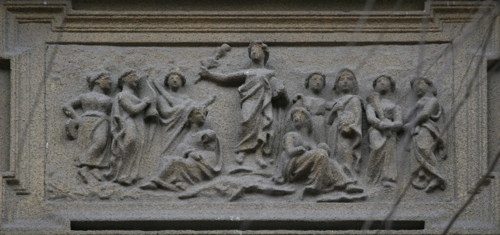 Prizemni pojas ove građevine je rustično obrađen. U simetričnim kvadratnim poljima na prvom spratu fasade nalazimo bogatu gipsanu i maltersku dekoraciju koja se javlja u vidu mitoloških predstava. U prvom polju sa leve strane nalazi se reljef sa prikazom Aurore, rimske boginje zore kako uzleće ispred kočije u kojoj sedi njen brat Sunce (Sol). Na sledećem reljefu prikazan je Apolon sa devet muza, zaštitnica umetnosti i nauke, gde svaka od njih drži svoje prepoznatljive atribute. Treća scena prikazuje Bahusa, antičkog boga vina i njegovu suprugu Arijadnu, u kočijama sa upregnutim lavovima i njegovim raskalašnim pratiocima, satirima.