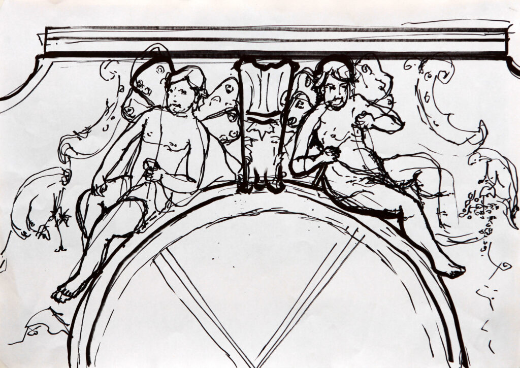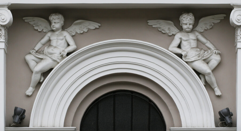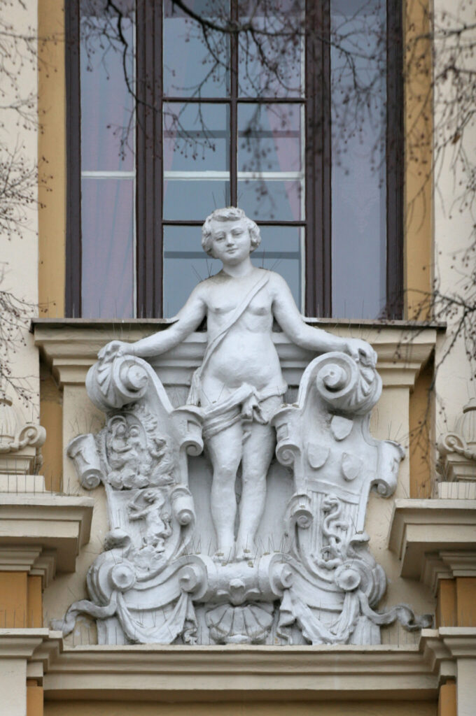 Napravljena je od gipsa i u dobrom je stanju. Može se primetiti da su figure i reljefi koji su pravljeni od gipsa izuzetno otporni. Imaju dug vek trajanja i što je najvažnije lako se održavaju. Sama priprema gipsa je veoma jednostavna. Zato je ovaj građevinski, a ujedno i vajarski materijal zahvalan za korišćenje na fasadama. Skulptura dečaka tretirana je prefinjenom modelacijom, u stilu poznog baroka. Saznajemo i da je pojedina dekoracija bila pozlaćena i oslikavana, što se vremenom izgubilo prilikom izvedenih restauracija fasade. Periferna plastika prvog sprata u baroknom stilu naglašena je bogatom floralnom dekoracijom u vidu girlandi, kao i grotesknim satirima u punoj plastici. Mnoštvo dekorativnih elemenata uz primenu različitih materijala dovedeno je u skladnu, harmoničnu i raskošnu celinu.