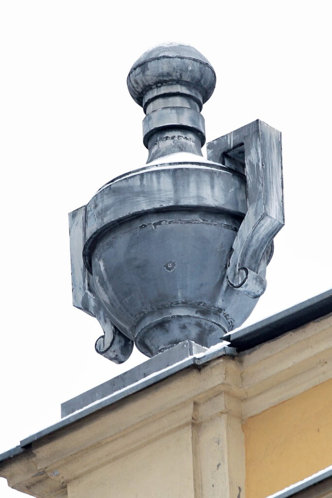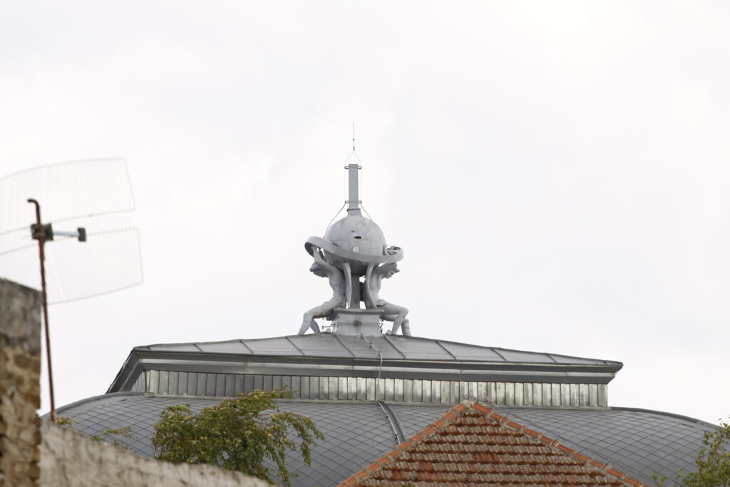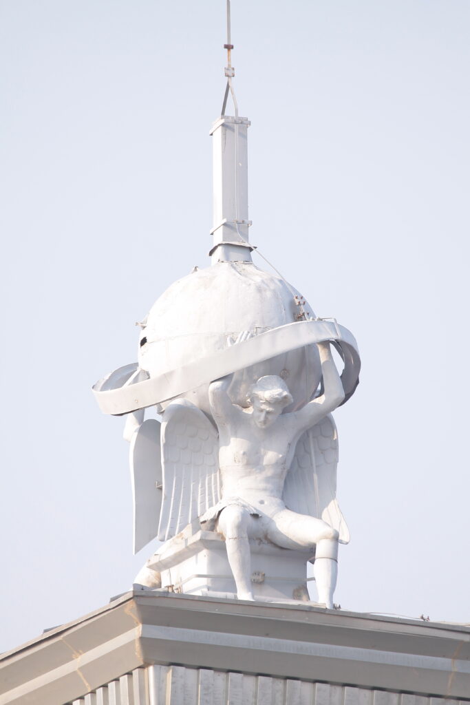 Na vrhu pročeone kupole sa lučnim prozorima u nizu, izvedene su dve sedeće figure anđela koje pridržavaju globus, nalik Atlantima. Na vrhu te kugle izvorno je bio postavljen krst, jer je ustanova u to vreme imala verski karakter. Ovakvo pozicioniranje skulptura na teritoriji zaštićenog jezgra Subotice, skulpture na krovu zgrade, nalazimo još samo na baroknoj Katedrali svete Terezije Avilske. Međutim, ovde imamo grupnu kompoziciju veoma specifičnog načina materijalizacije. Skulpture i globus rađeni su od cink lima, kovanjem, a zatim ofarbane sivom bojom. Figure su na osnovu ovog načina izrade tretirane veoma realistično, tako da se kroz formu oslobađa pokret i unutrašnji naboj muških tela i njihovih krila koji na nešto savremeniji način predstavljaju anđele. Upotrebu cink lima nalazimo na još jednom Rajhlovom objektu, Nacionalnoj kasini, današnjoj Gradskoj biblioteci, kao i na zgradi Putnika, koju su projektovali Komor i Jakab. Ovi limeni detalji ukrašavali su krovove gradskih velelepnih objekata u vidu cvetnih motiva secesije i neobaroknih amfora.