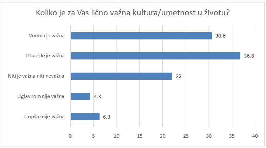 Tako kulturu veoma važnom ocenjuje 51,1% ispitanika starosti od 35 do 57 godina, 42,2% dobi od 19 do 34 godine, u poređenju sa 18,8% mladih od 15 do 18 godina.