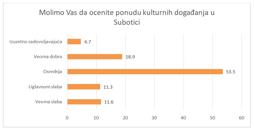 Ono oko čega se slažu svi, bez obzira na uzrast, jeste, pak, procena kulturne ponude u gradu, koja je za preko polovinu ispitanika (53,5%) osrednja, dok je za 16,7% mladih od 15 do 18 godina i 6% starijih ona čak veoma slaba.