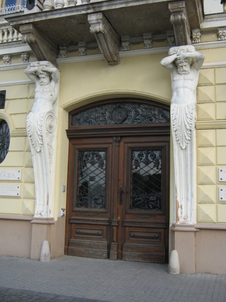 Na uglu objekta je telo Atlanta postavljeno tako da od struka na gore izrasta iz velike jonske volute ukrašene palmetom, dok su njegove ruke podignute iznad glave držeći teret erkera. Voluta koja predstavlja bazu Atlanta do sada je bila više puta restaurirana i popravljana, a nakon toga ofarbana fasadnim premazom. S obzirom da se vlaga sliva ispod erkera niz figuru Atlanta, najviše se zadržava u prizemnom pojasu, što slabi čvrstoću materijala. Ovde je profilacija ćoška ujedno i najuža, a kombinacija tereta na već oslabljenom materijalu dovodi do stalnog pucanja. Nasuprot subotičkom Atlantu koji nosi erker ugaonog objekta, u Baji nalazimo dva Atlanta kako nose centralni balkon, a smešteni su sa obe strane glavnog ulaza Gradske kuće čiji je današnji izgled projektovao Mihalj Jenei (Jeney Mihály) 1896. godine u stilu neorenesanse. Gradska kuća u Baji nalazi se na Trgu Svetog Trojstva 1. Ovakve Atlante nalazimo još u Beogradu u Knez Mihajlovoj 52 kako akcentuju arhitektonske detalje fasade.