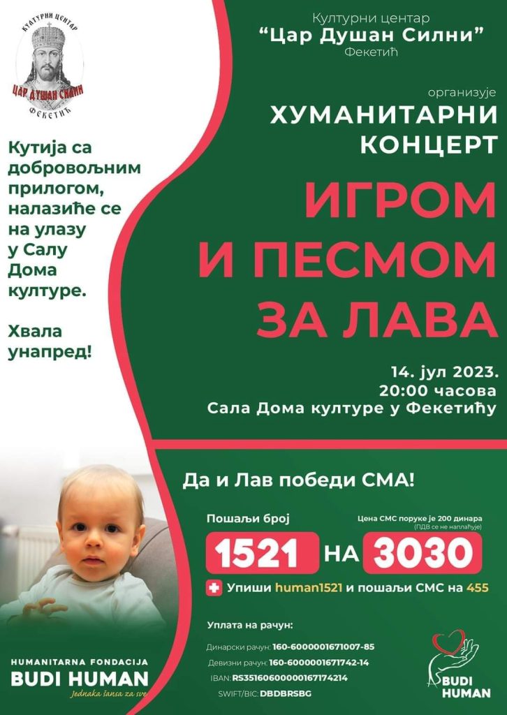 Humanitarni koncert “Igrom i pesmom za Lava” u organizaciji Kulturnog centra “Car Dušan Silni” iz Feketića biće održan u petak, 14. jula, sa početkom u 20 časova u sali Doma kulture u tom selu.