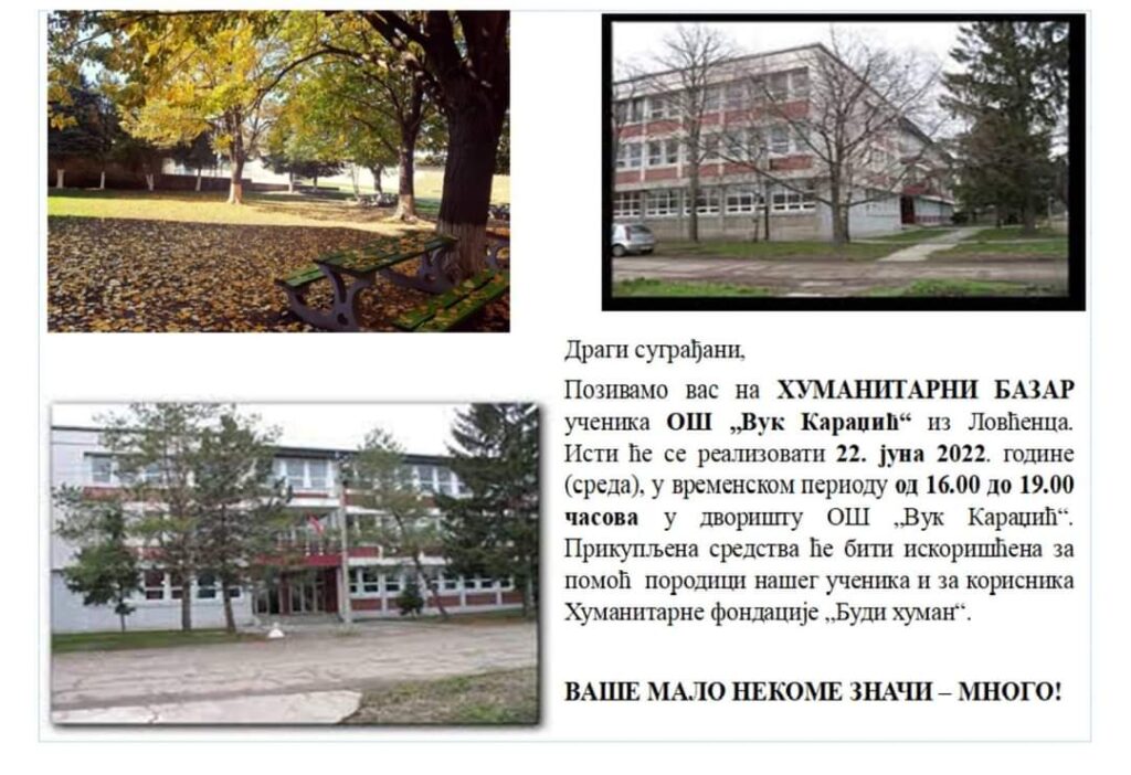 Pod sloganom “Vaše malo nekome znači mnogo! Budi promena koju želiš videti u svetu”, učenici Osnovne škole “Vuk Karadžić” iz Lovćenca, koja broji oko 230 učenika, organizuju humanitarni bazar, koji će biti održan u sredu, 22. juna, u školskom dvorištu.