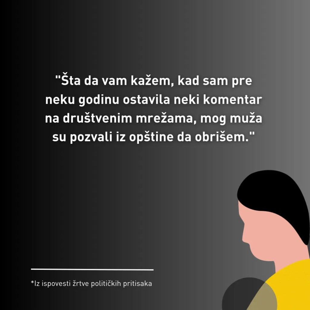 “Najveći je problem što se ljudi jako teško odlučuju da prijave pritiske jer nemaju poverenja u institucije. Druga dimenzija je strah, odnosno nedostaje društvene osude političkih pritisaka. To se kod nas normalizuje, a neki ljudi čak pritiske vide kao fer borbu stranaka, a da pritom ne shvataju ni da je to protivzakonito”, objašnjavaju u CRTI.