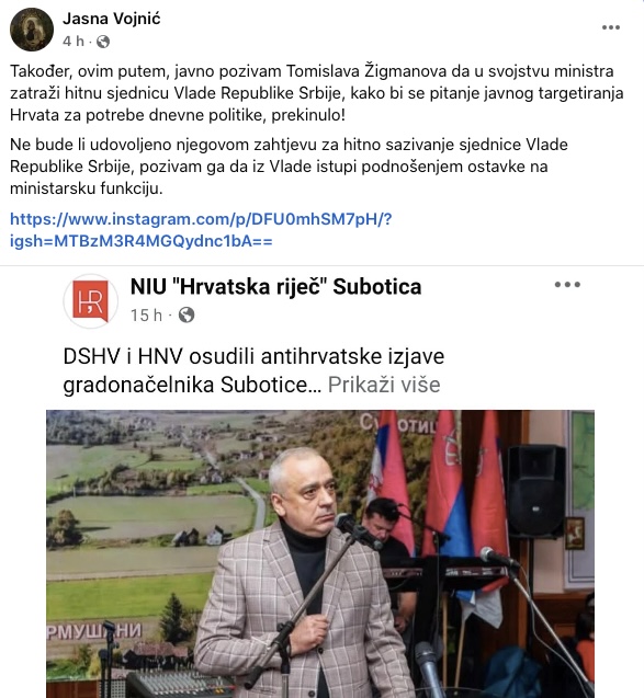 Predsednica Hrvatskog nacionalnog vijeća (HNV) Jasna Vojnić pozvala je danas ministra za ljudska i manjinska prava i društveni dijalog Tomislava Žigmanova da u svojstvu ministra zatraži sazivanje hitne sednice Vlade Srbije „kako bi se pitanje javnog targetiranja Hrvata za potrebe dnevne politike – prekinulo“.
